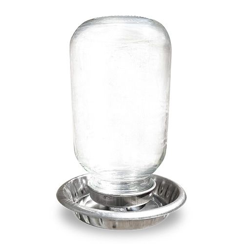 - Chick drinker with a stainless steel metal base and a glass mason jar